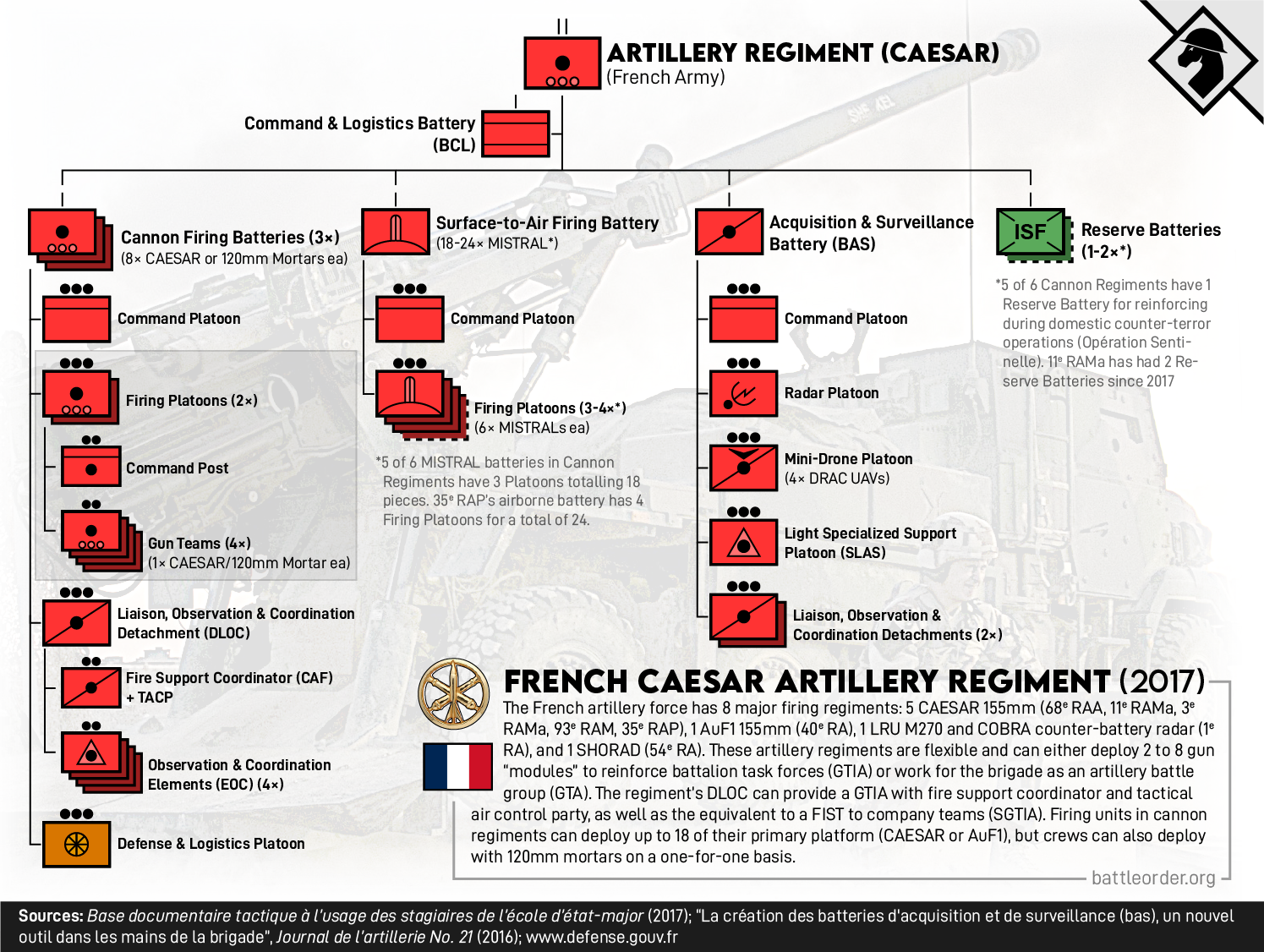 The Régiment canon CAESAR is one type of artillery regiment (battalion-equivalent) in the French Army that typically generates 2 to 8-gun "modules" to support battalion task forces (GTIA) or support combined arms brigades as part of an artillery battle group (GTA). Graphic also available in French. (Click to enlarge)