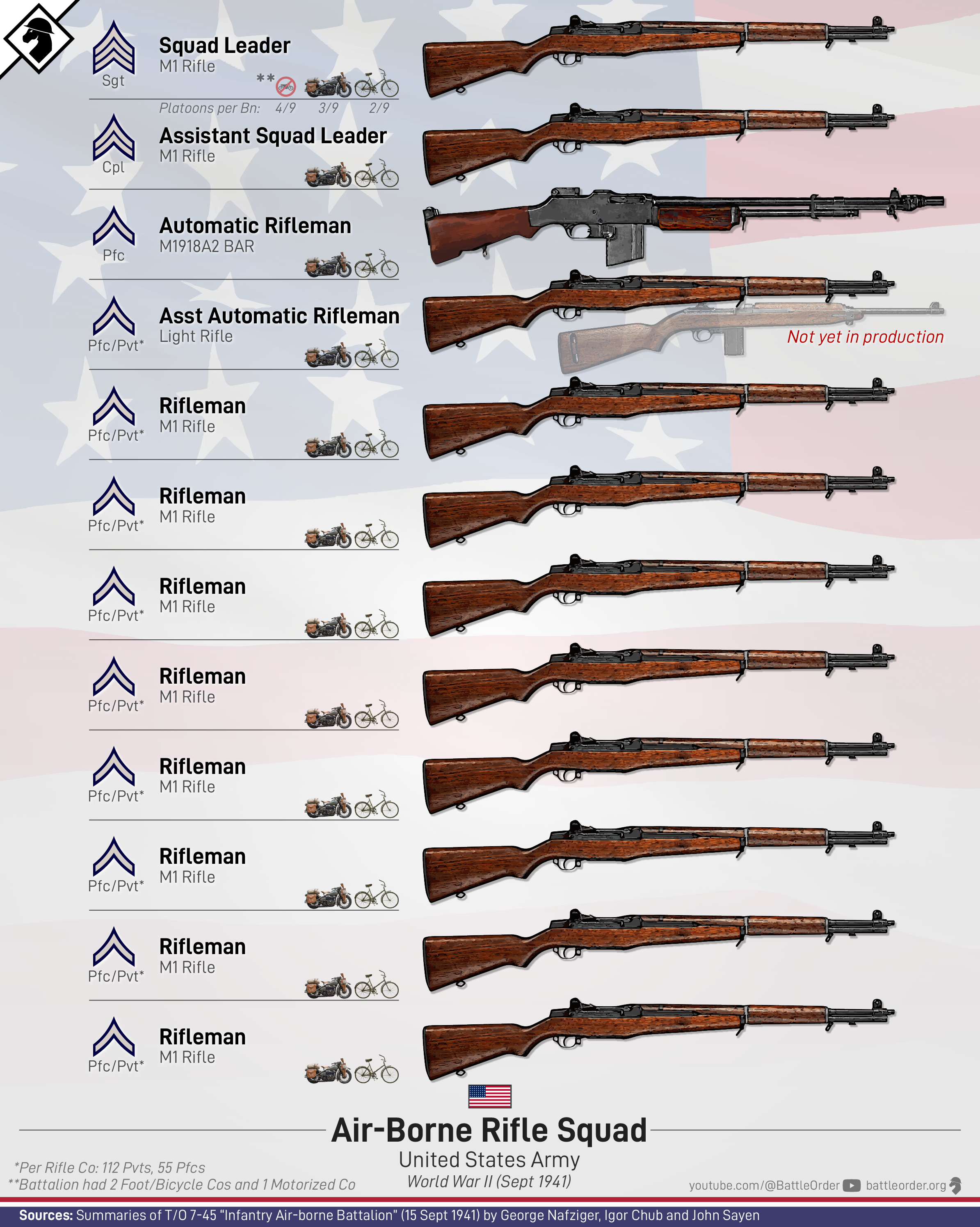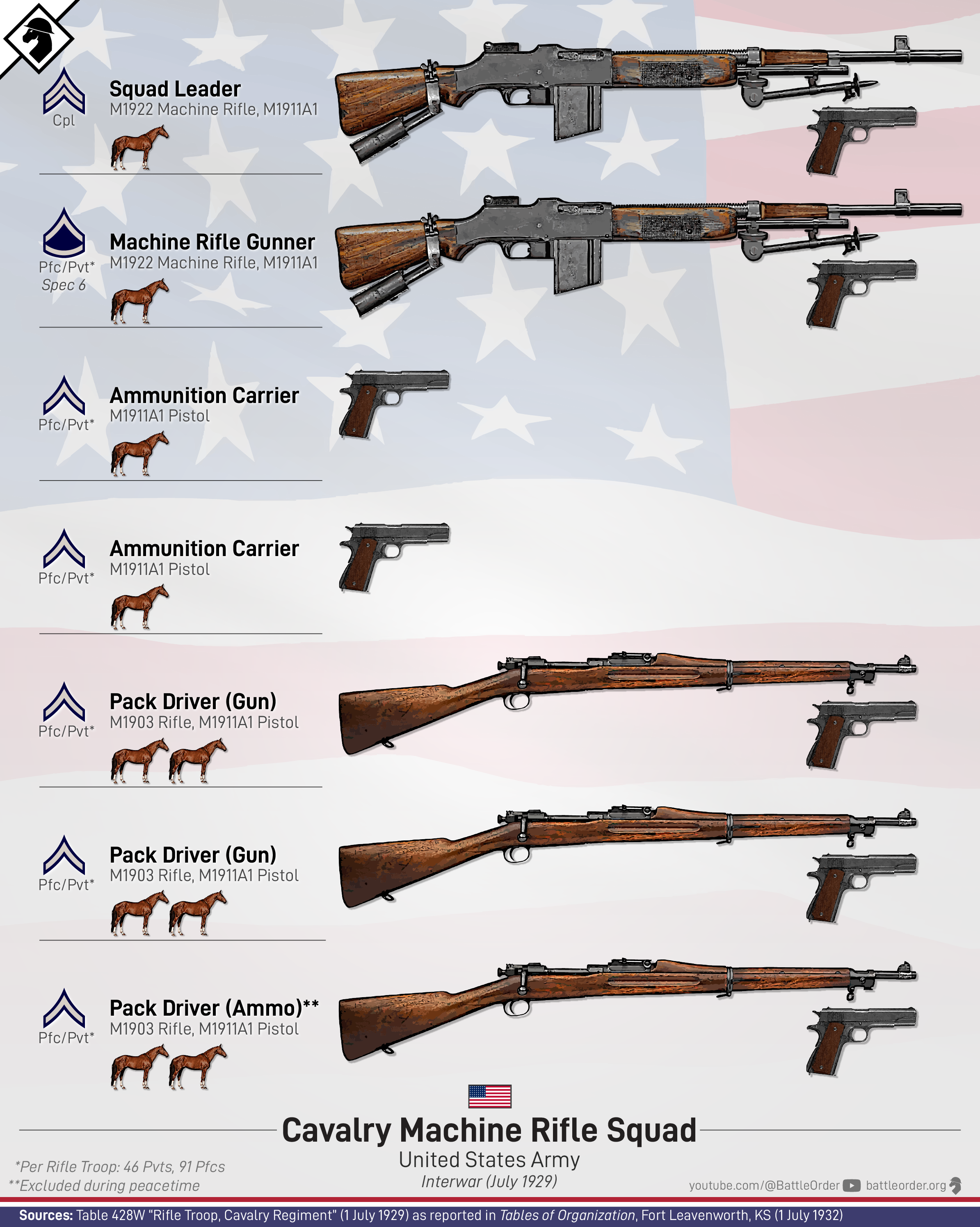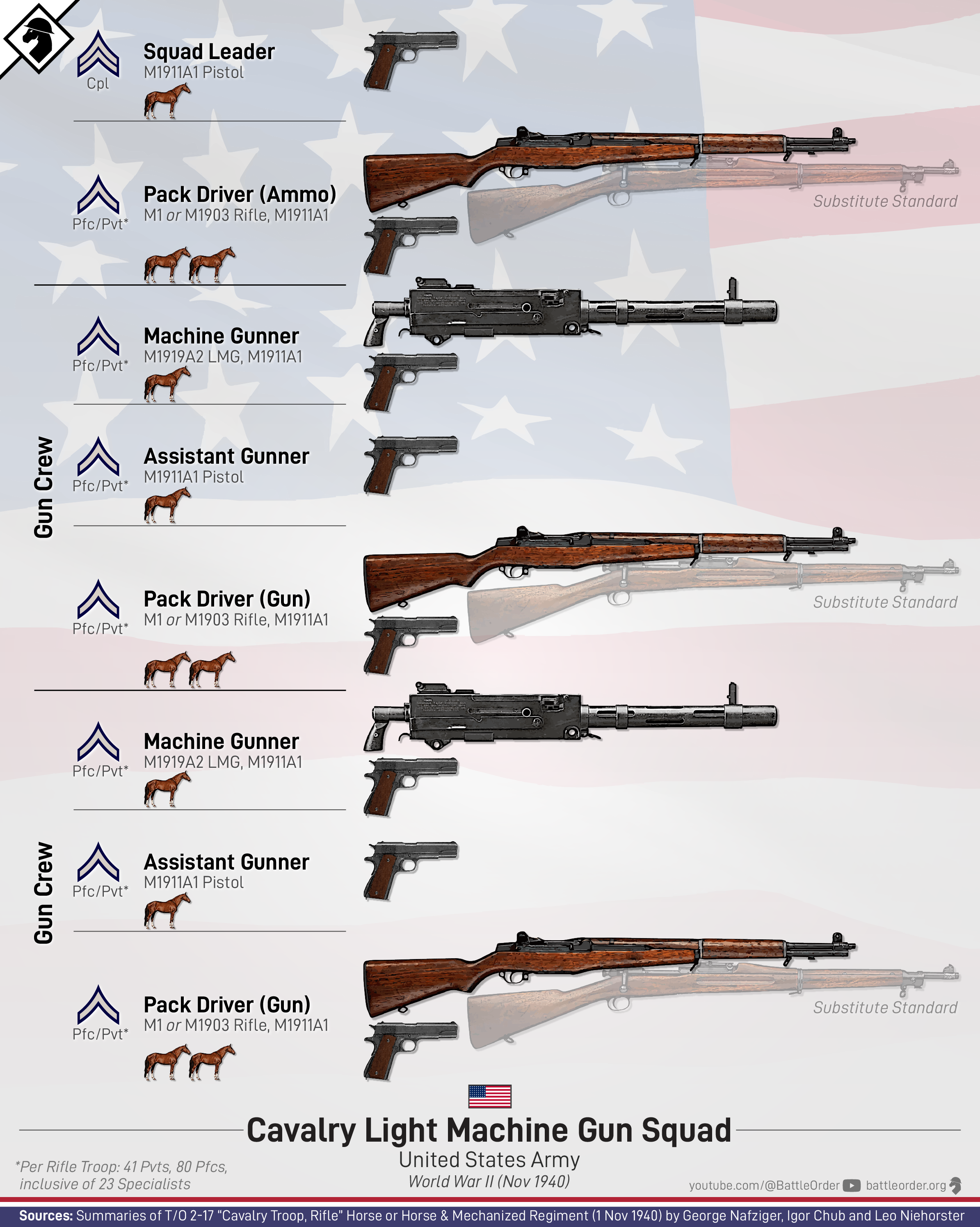 U.S. Army Air-Borne Rifle Squad (15 September 1941) One of the early Rifle Squad organizations for airlanding troops, which would evolve into the Glider Infantry Regiments. They were basically identical to regular infantry squads, although they interestingly included the hypothetical Light Rifle for the Assistant Automatic Rifleman (what would be adopted as the M1 Carbine this month, but not issued until 1942). | U.S. Army Cavalry Light Machine Gun Squad (1 November 1940) In the early 1940s the U.S. Army Cavalry Rifle Troop (the horse-mounted infantry kind, not the mechanized kind) had a Machine Gun Platoon. In 1940 they operated the M1919A2, a version of the original tank-mounted M1919 modified for cavalry use. Each squad had 2 machine guns, 8 riding horses, and 3 pack horses (2 for guns and 1 for ammo). | |