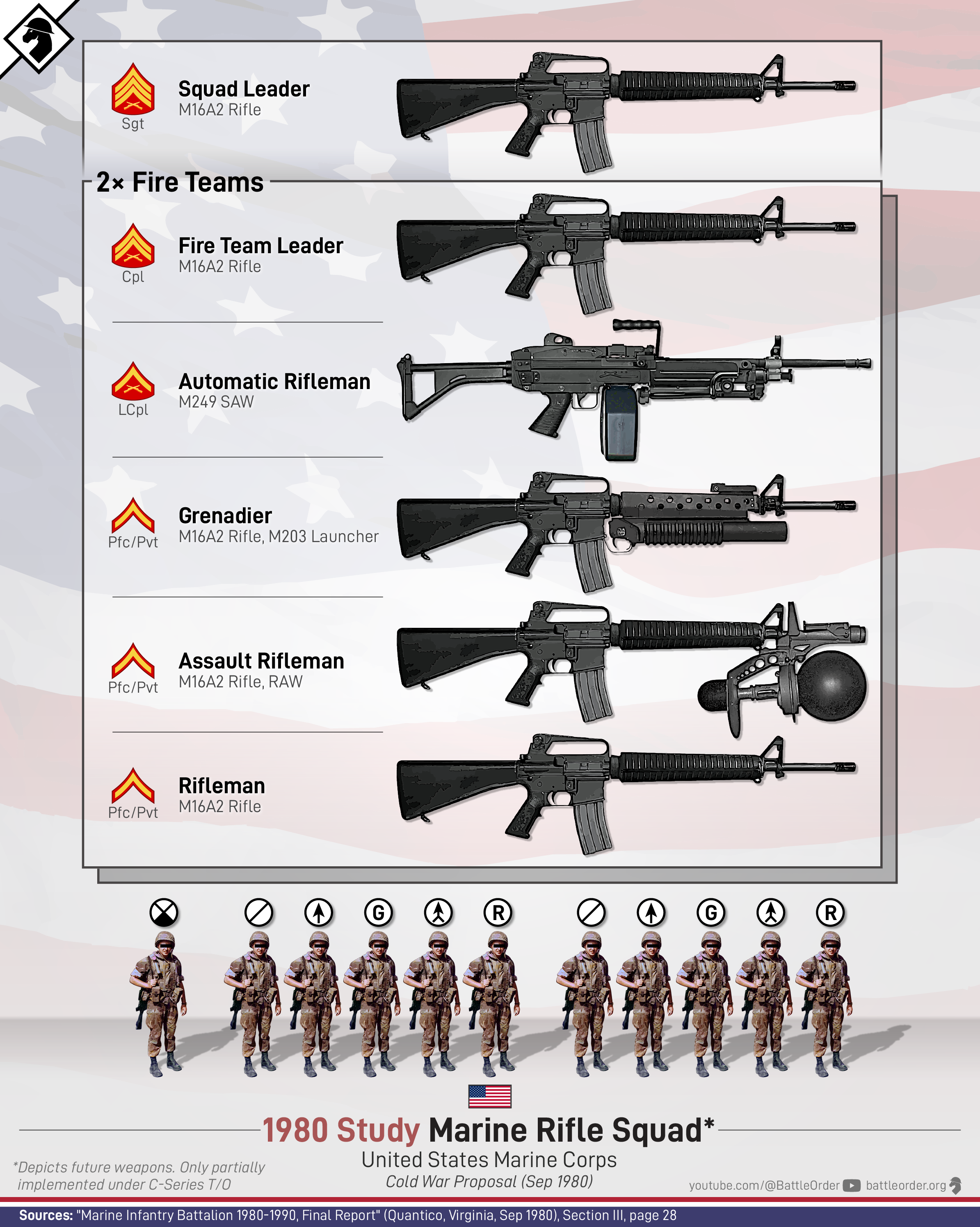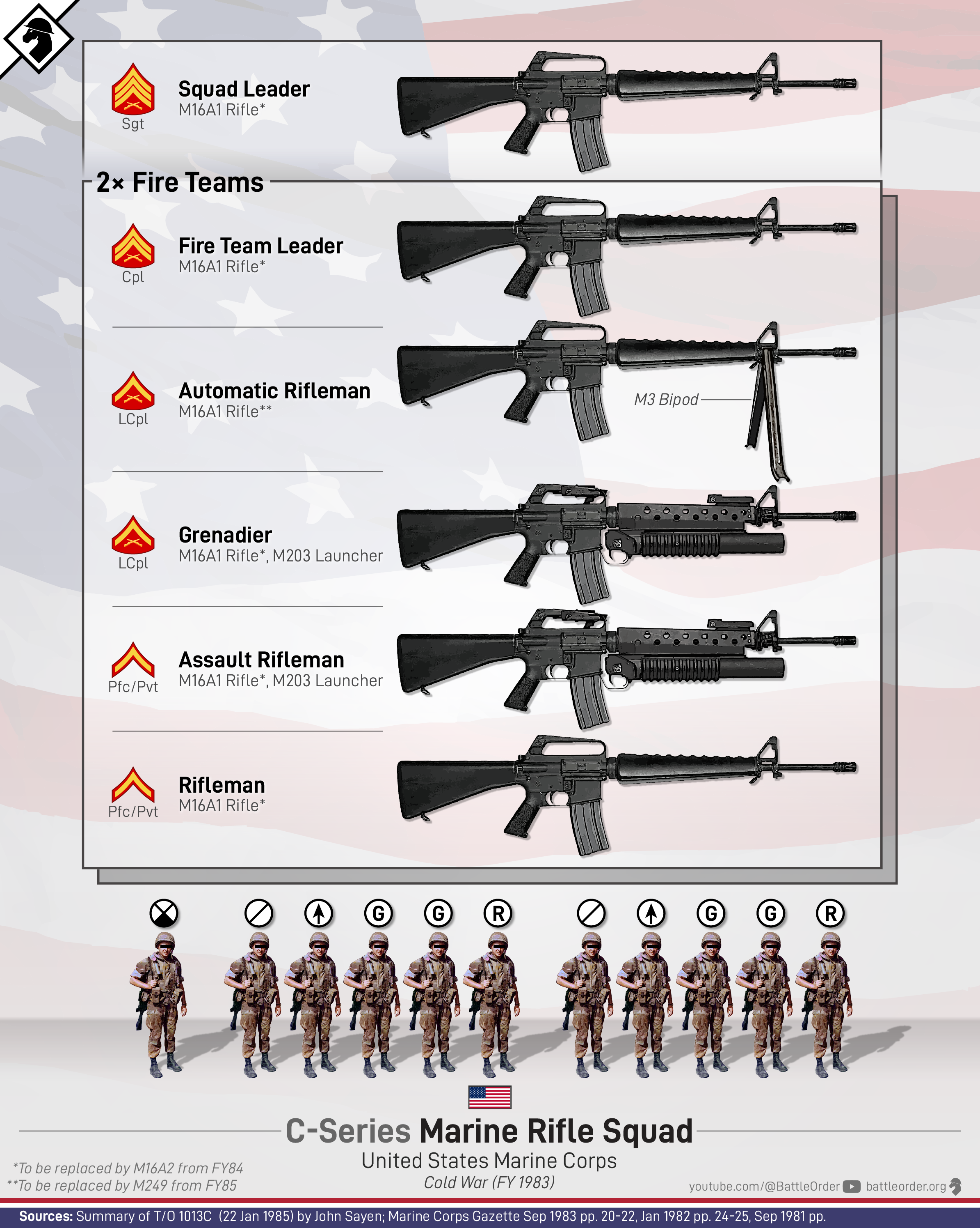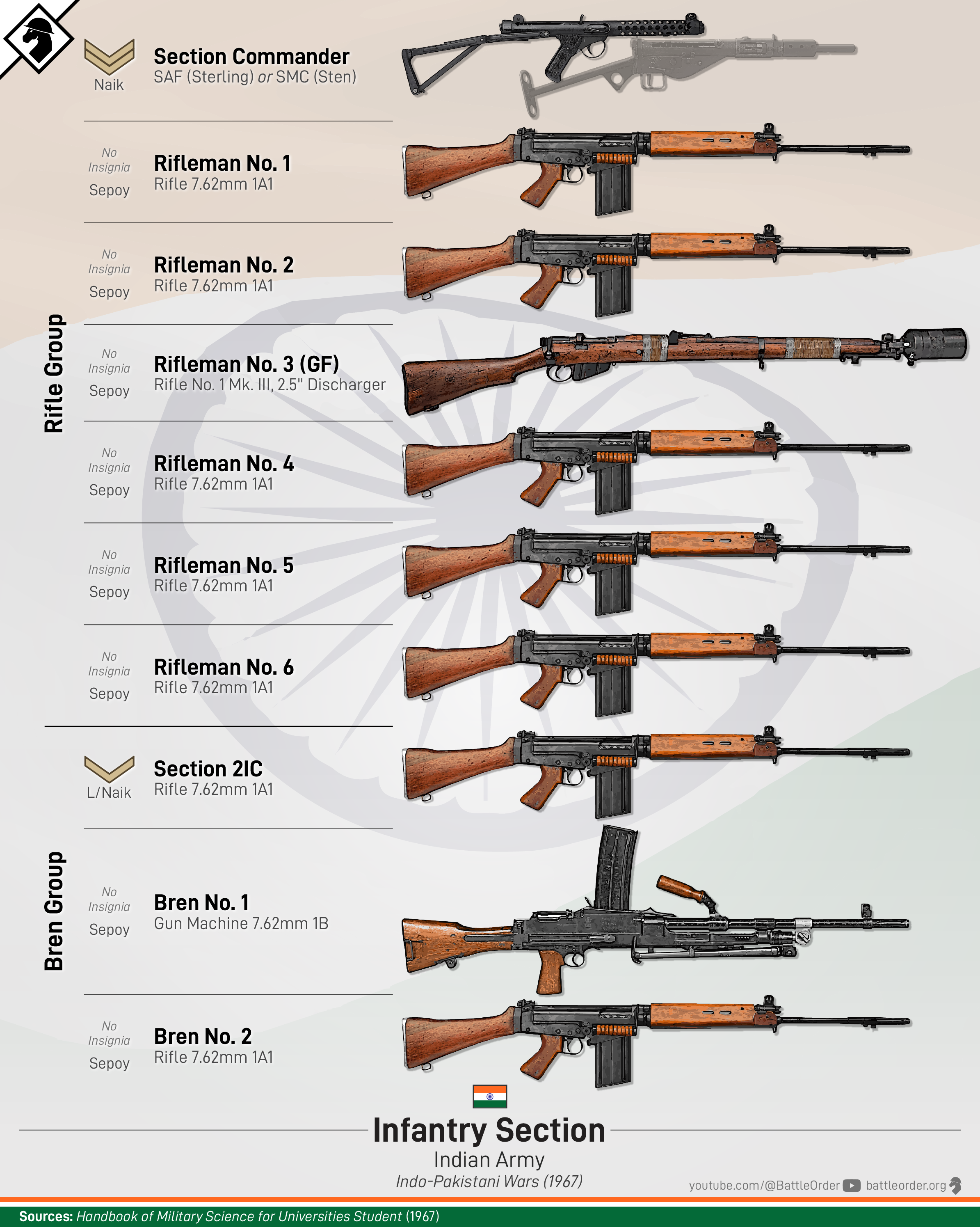 U.S. Marine Rifle Squad (1982), C-Series T/O Standard in active battalions from FY83-FY85, although all battalions were not converted before it was announced replaced in mid-1985. 3/6 Marines converted to it in Oct 1982 and 2/8 Marines was organized as such when it was part of 22d MAU during Operation Urgent Fury and its Nov 1983 deployment to Beirut. | Indian Infantry Section (1967) A theoretical Indian Infantry Section manual based on an officer candidate training manual from 1967. Rifles are domestically produced 1A1s, which were a mix of inch and metric pattern FN FALs. The machine gun is a variant of the British L4 Bren in 7.62mm. Both Sterlings (SAF) and Stens (SMC) were in service at the time, and the SMLE was designated for grenade firing. | |
