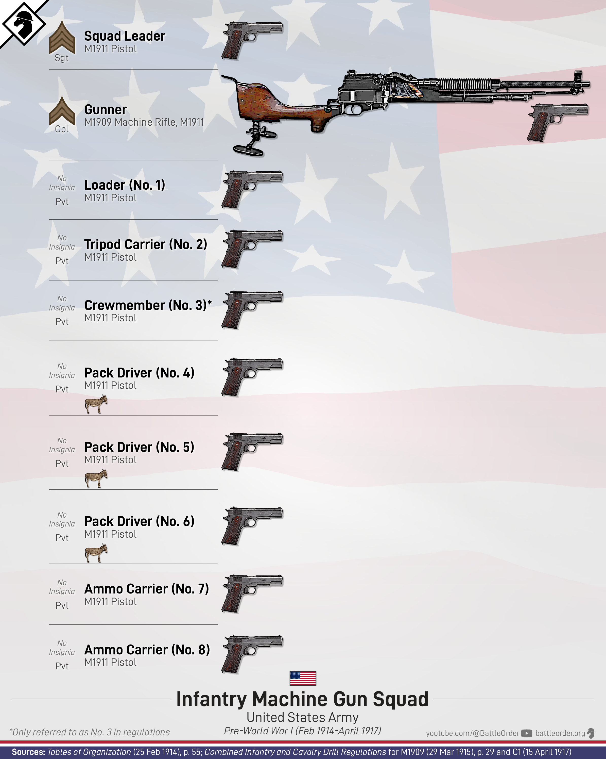 U.S. Army Cavalry Machine Rifle Squad (1 July 1929) Before the M1919A2 Machine Gun Platoon, U.S. Army Cavalry Rifle Troops had a Machine Rifle Platoon operating the M1922 Machine Rifle (a version of the M1918 Automatic Rifle modified for cavalry use). The Machine Rifle Platoon had enough squads to attach one to each Rifle Platoon. | U.S. Army Infantry Machine Gun Squad (25 Feb 1914) An early pre-World War II U.S. Army Machine Gun Squad operating the M1909 Benét–Mercié machine gun. Each Infantry Regiment was authorized a Provisional Machine Gun Company with 4 guns in wartime or 2 guns in peacetime. Note that the Infantry Regt T/O actually has enough pack mules for 4 per squad, the same as in Cavalry Regiments. However, I am depicting the organization laid out in the M1909 drill manual of 1915 and 1917 with 3 draft mules per infantry squad. This is more consistent with the allotment of privates in the T/O and it is specifically juxtaposed against the cavalry version with 4 draft mules. However, if they had 4 draft mules then No. 7 would be a Pack Driver, although the 4-mule cavalry version had 2 additional crew per squad. | U.S. Army Light Motorized Rifle Platoon, 9th Infantry Division (1 April 1987) This was a special Rifle Platoon design tested by the 9th Infantry Division as part of its Light Motorized/High-Technology Testbed concept. It features my recreation of the M998T Interim Squad Carrier, which was a “heavy” 2-door M998 modified with roll bars, seats, seat belts, and a Mk19 automatic grenade launcher. The 9th Infantry Division had a huge allotment of Mk19s as it was likely testing them as part of its mission. |