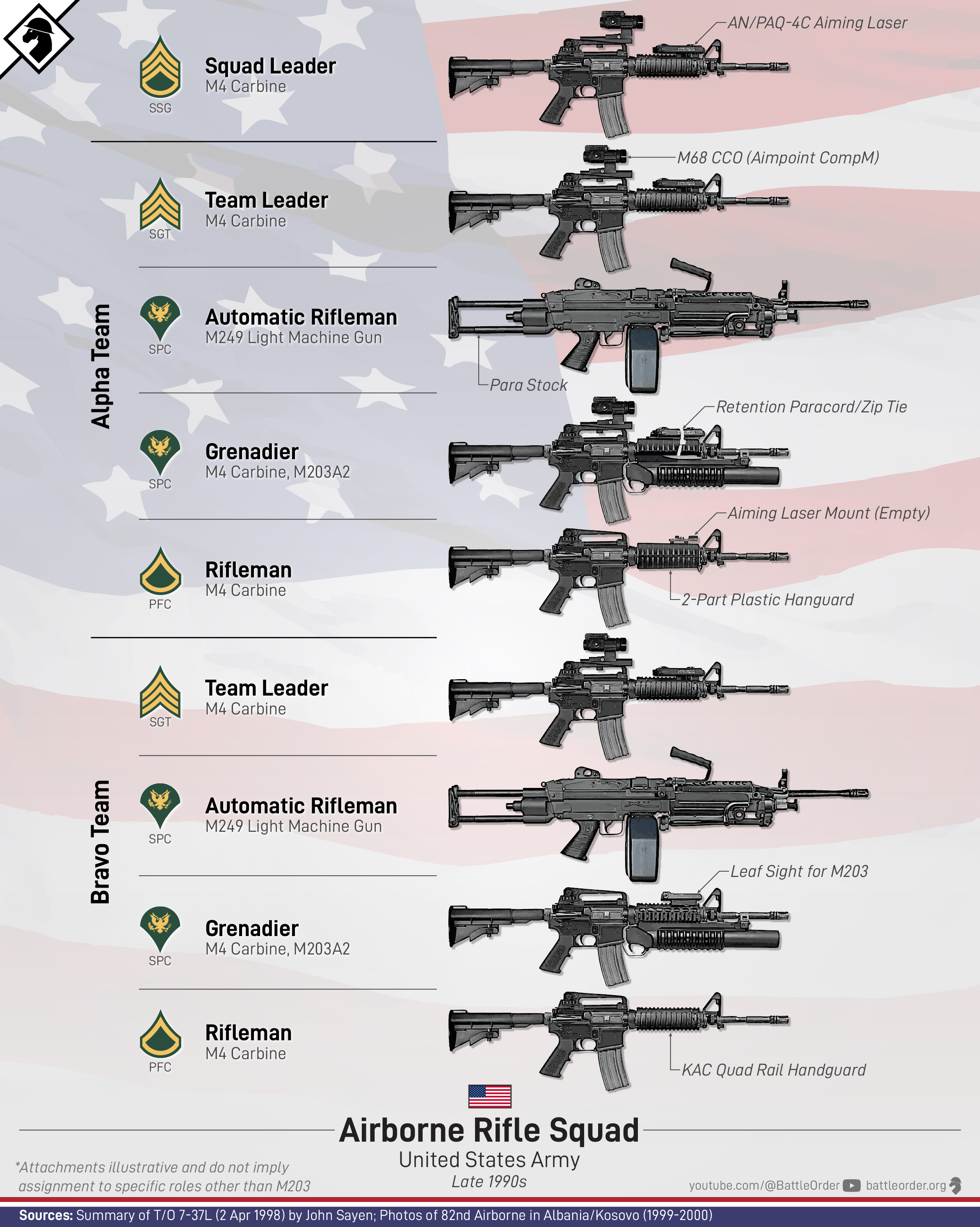 The structure was the same as it was from AOE to today: 9 soldiers, 1 Squad Leader (Staff Sergeant) and two Fire Teams consisting of a Team Leader (Sergeant), Automatic Rifleman, Grenadier, and Rifleman. What was interesting was their setups. The late 1990s was a transitionary period for U.S. Army infantry equipment. The setups on the graphic are based on photos of the 82nd Airborne Division's deployments to the Balkans in 1999-2000. The M4 Carbine was already ubiquitous in this unit and the Automatic Riflemen were mainly armed with M249s with a para stock, standard barrel, and no rail for optics. The gradual introduction of the M4 Carbine and its flattop rail in the special-adjacent infantry types was one thing, but this was also the period that the conventional force would get its first taste of optics-for-all, aiming lasers, and quad rail handguards for attachments.