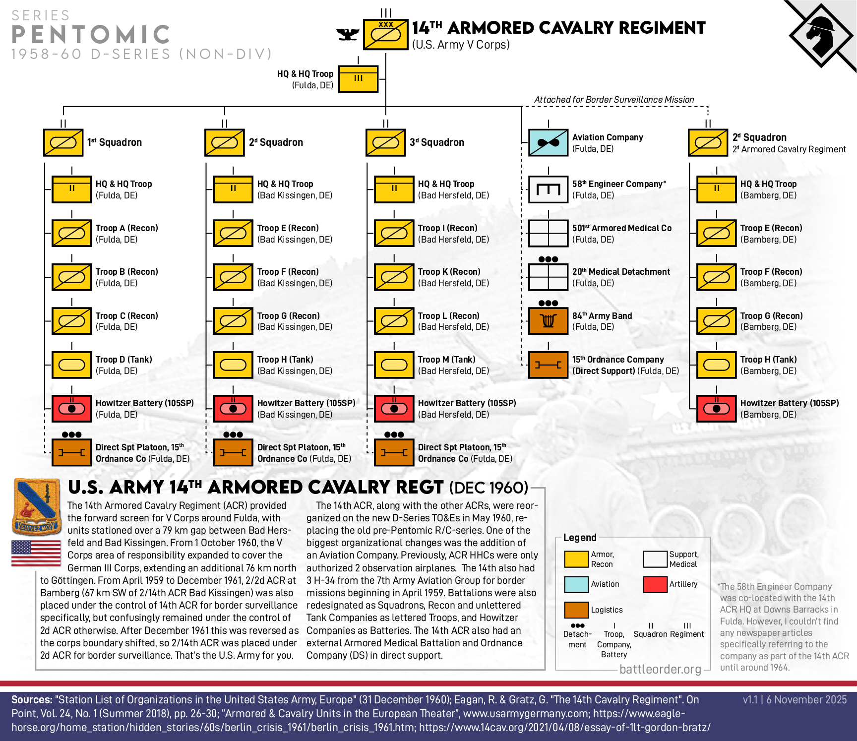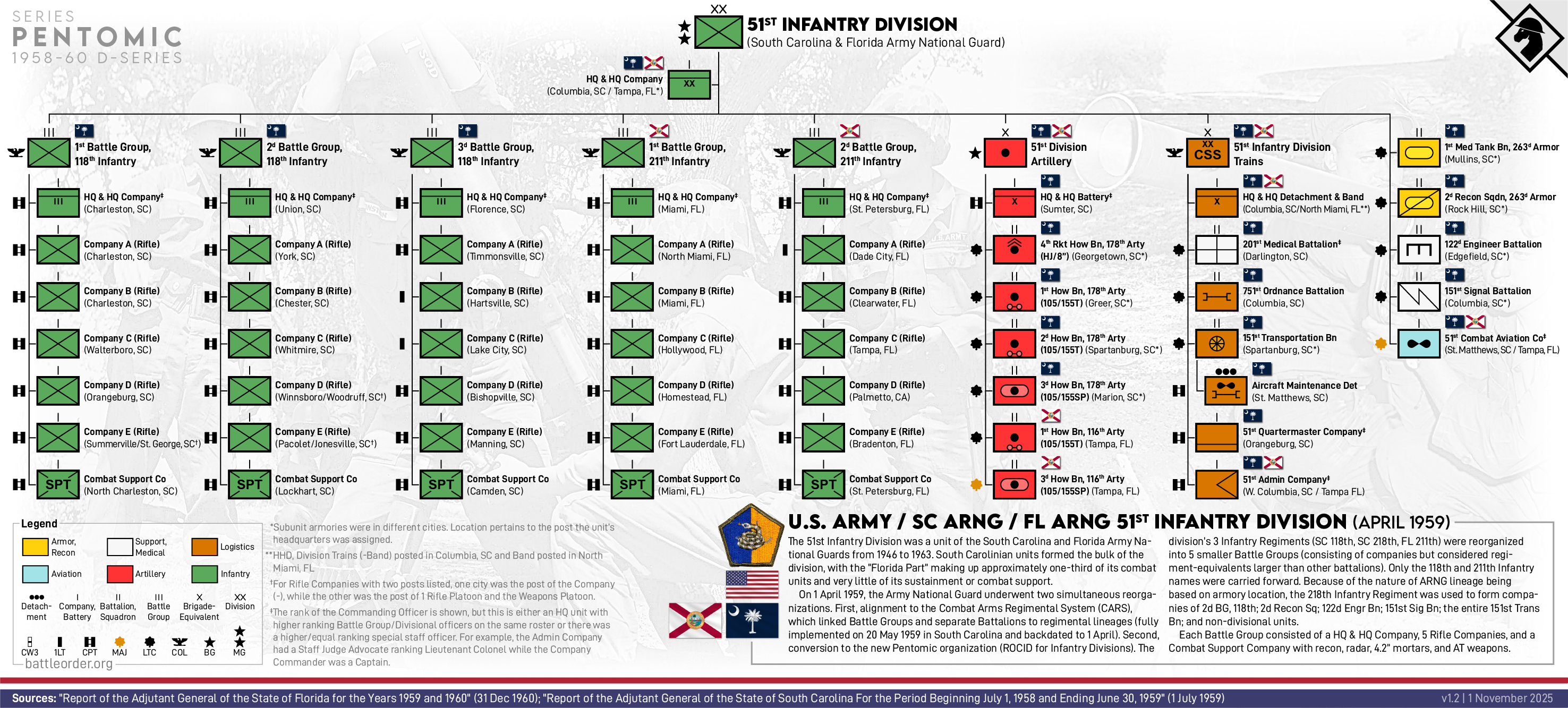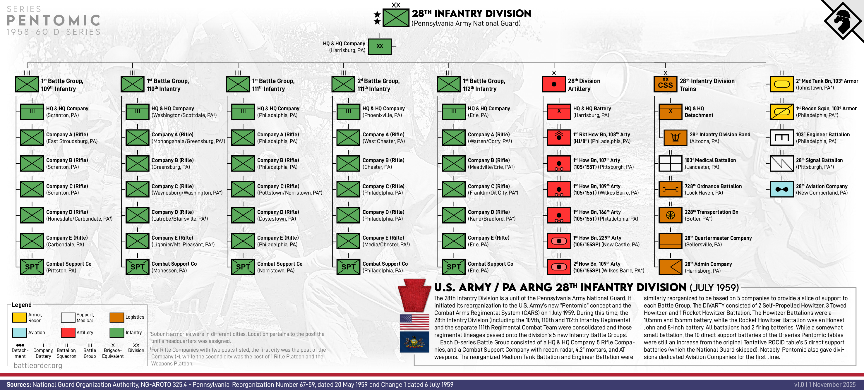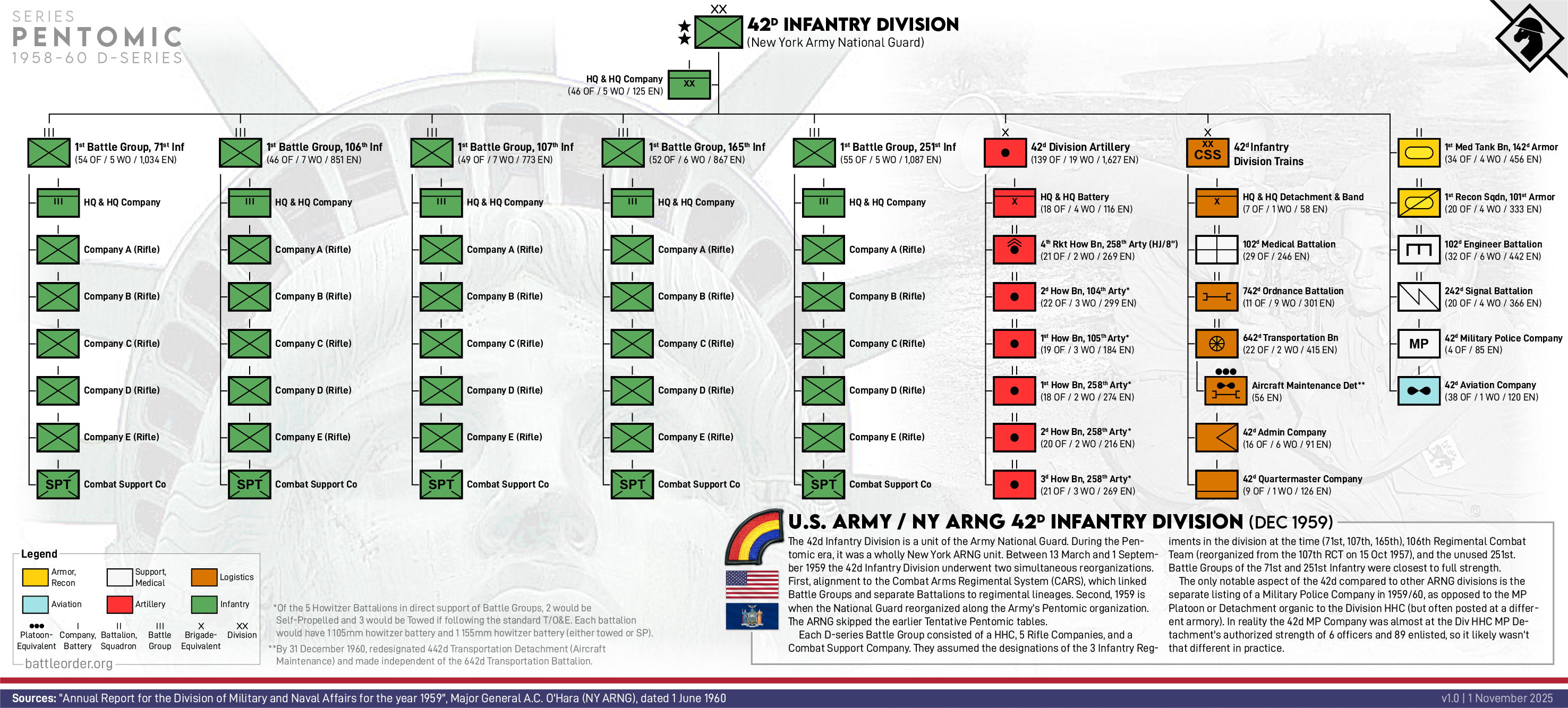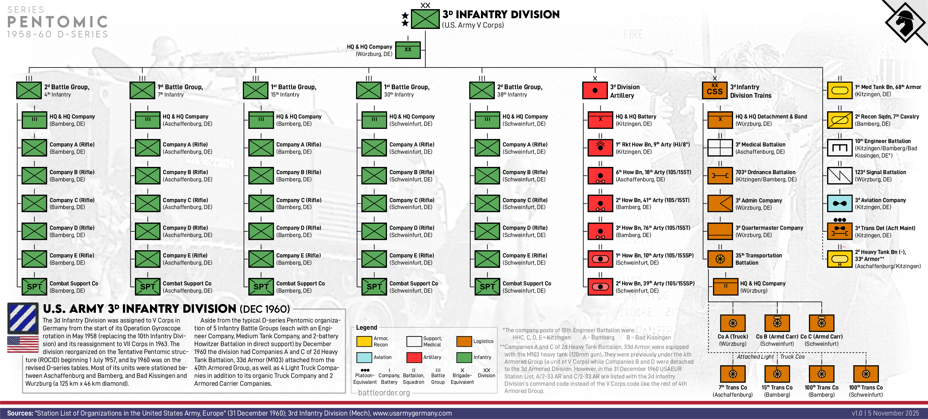 This does not cover the breadth of the 1950s and 1960s as the Army was organized along different concepts in the early- to mid-1950s and after 1963. This also does not necessarily cover every year of a division's Pentomic organization, as tweaks were made to the structure in 1959/1960. It also does not cover units organized along older pre-Pentomic tables even if they existed in the late 1950s. See the graphics for the specific year being covered.