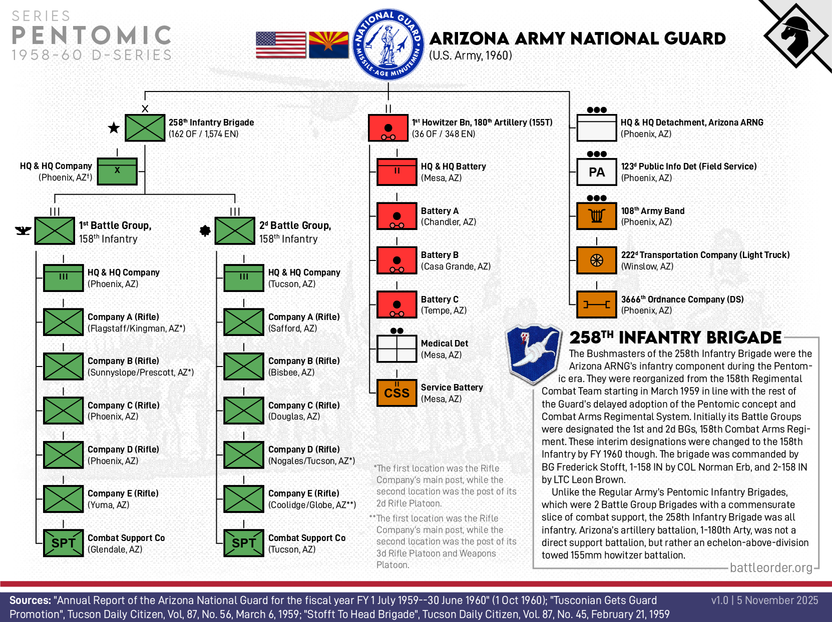 Organized on 1 March 1959 from the 158th Infantry Regiment. The entire organization of the Arizona Army National Guard in fiscal year 1960 is also included in this graphic.