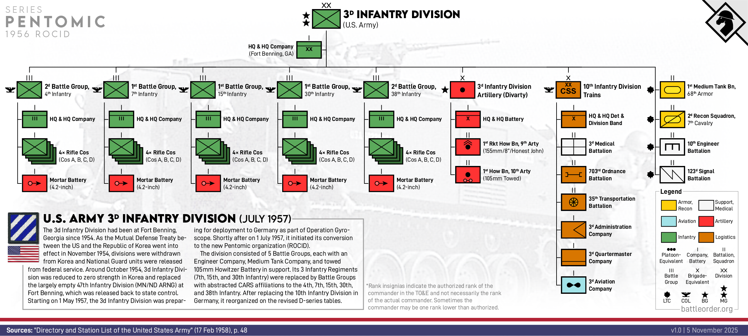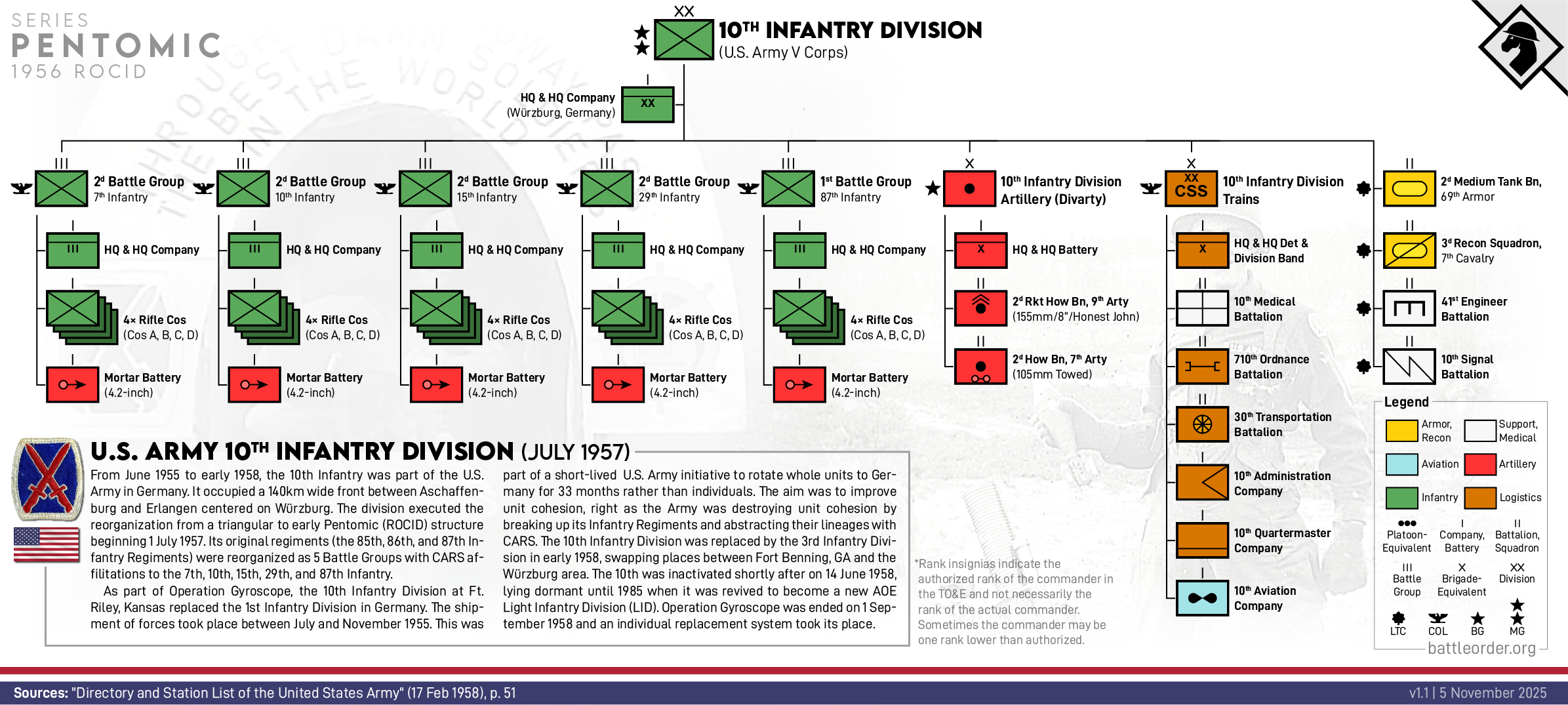 Reorganized as a ROCID Pentomic division on 1 July 1957. Deployed to Germany under Operation Gyroscope replacing the 10th Infantry Division, with shipping taking place between 4 March to 26 May 1958. Both the Early Pentomic (Tentative) and revised D-Series Pentomic (1960) organizations are shown.