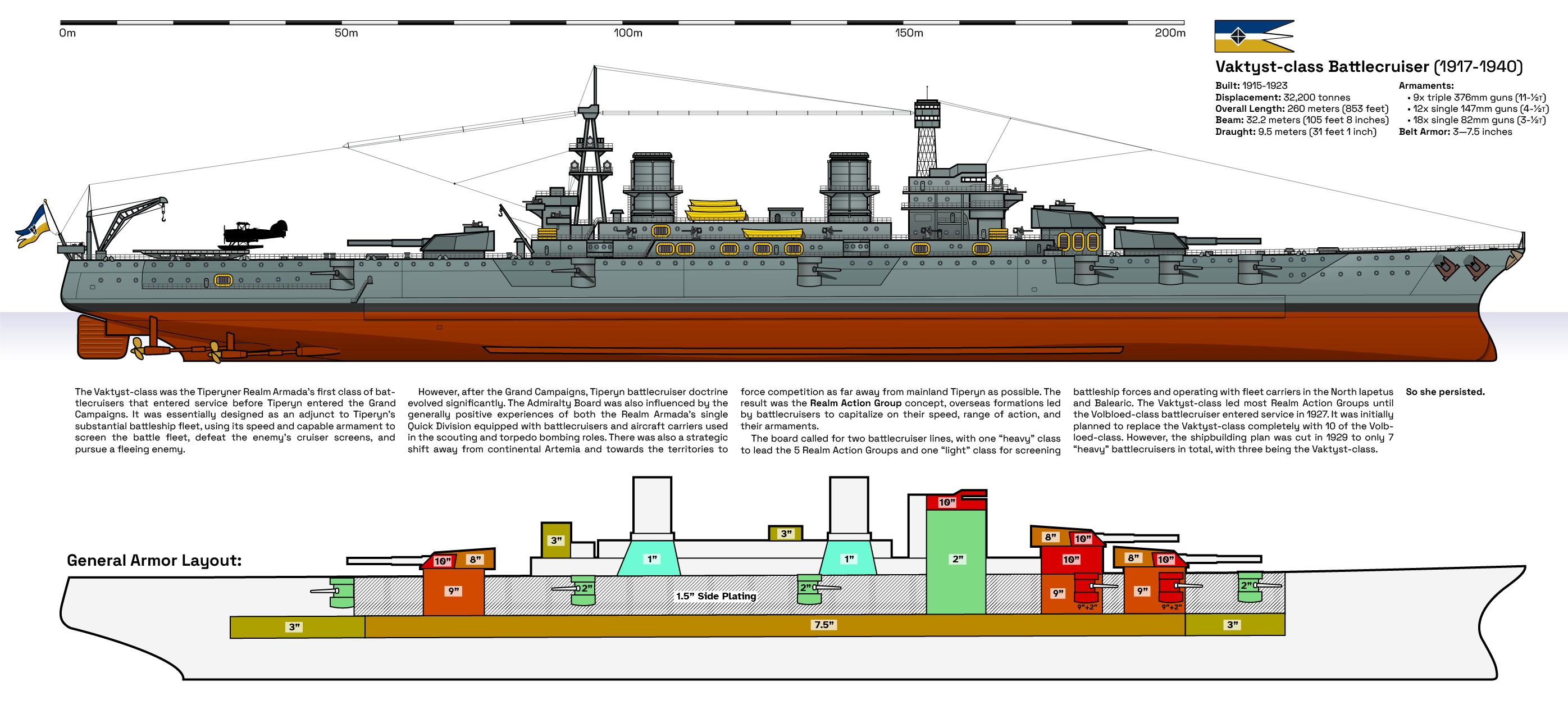 The board called for two battlecruiser lines, with one "heavy" class to lead the 5 Realm Action Groups and one "light" class. The light class was envisioned for destroying enemy cruiser screens and conducting reconnaissance in support of battleships in the North Iapetus and Balearic, as well escorting fleet carriers and harassing enemy aircraft carriers. Meanwhile, the heavy class would essentially be Tiperyn's capital ships forward deployed abroad, akin to fast battleships. The lighter Vaktyst-class led most Realm Action Groups until the Volbloed-class battlecruiser entered service in 1927. The Admiralty Board initially planned to replace the Vaktyst-class completely with 10 of the Volbloed-class. However, the shipbuilding plan was cut in 1929 to only 7 “heavy” battlecruisers in total, with three being the Vaktyst-class. So the Vaktyst persisted until 1940, when the TNV Skarbek was decommissioned.